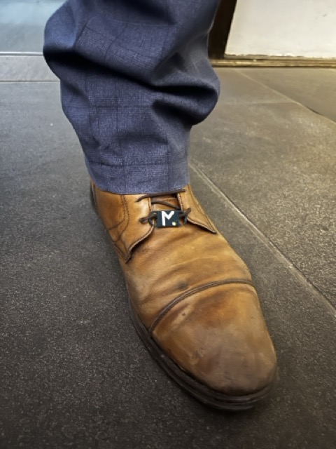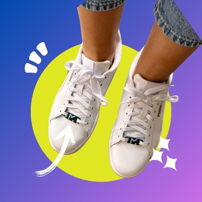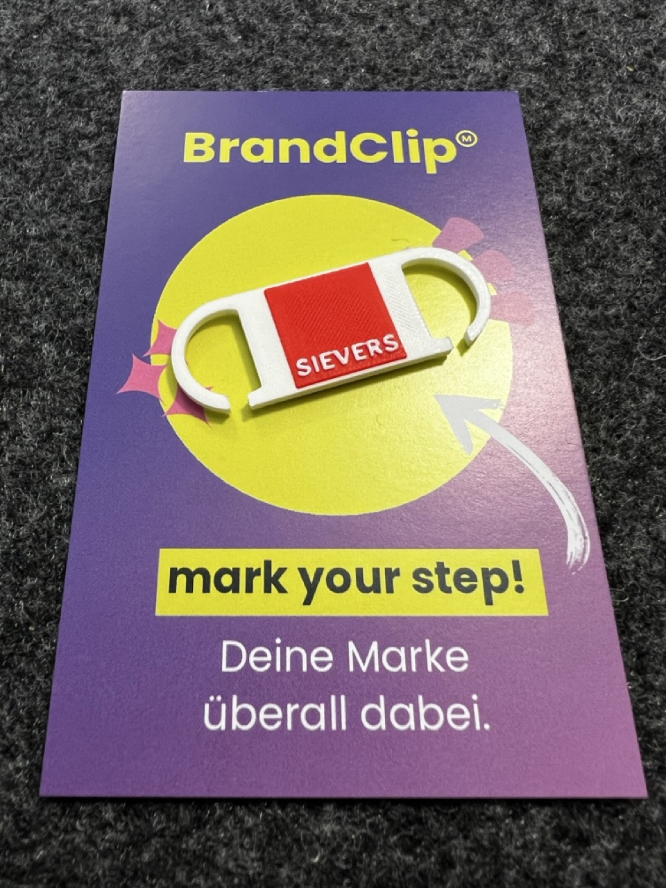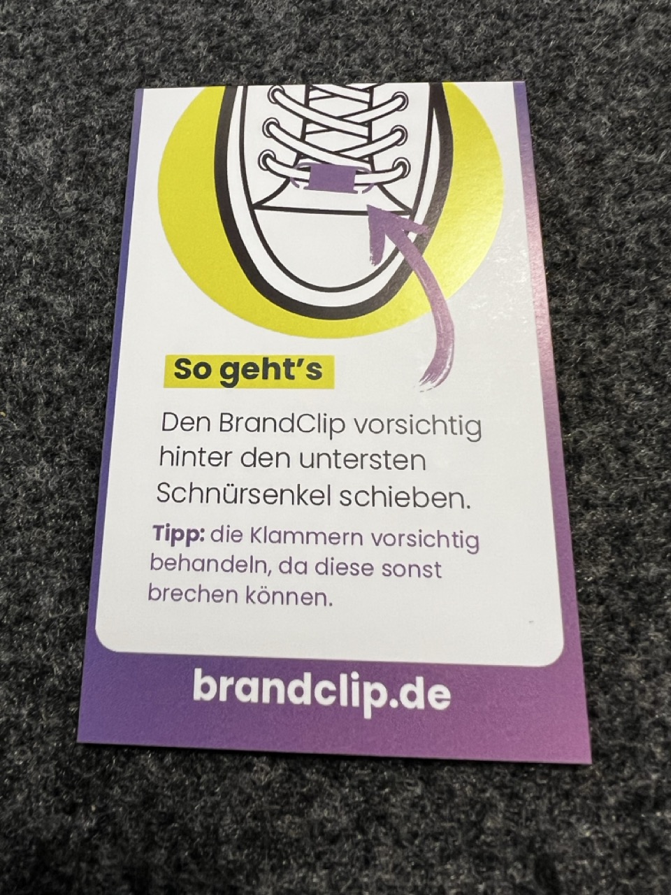 Der BrandClip ist ein kleines, rechteckiges Accessoire, das an den unteren Schnürsenkeln von Schuhen befestigt wird.